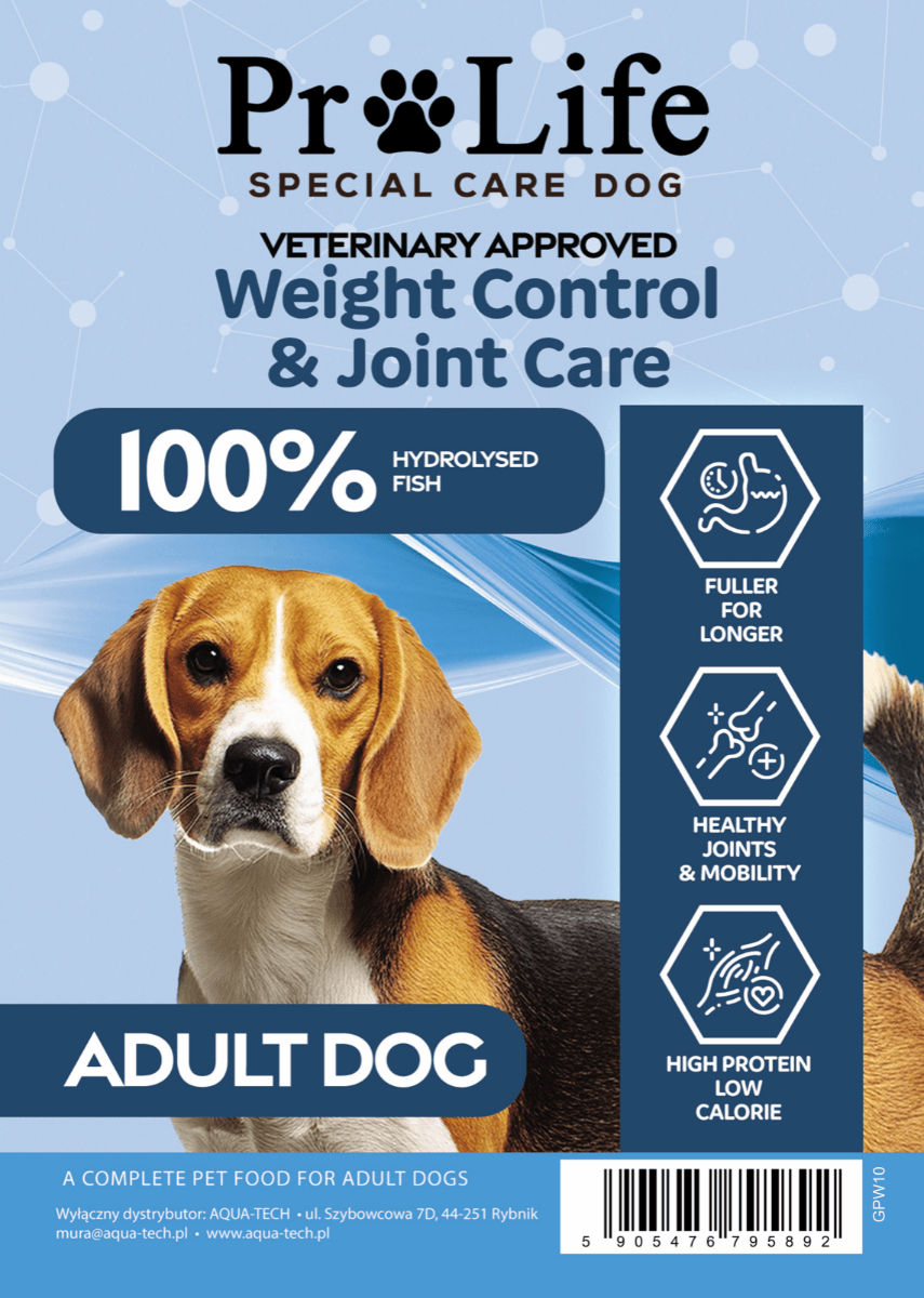 Dwa najczęstsze problemy zdrowotne dorosłych psów — nadwaga i problemy stawowe — często idą w parze. ProLife Weight Control & Joint Care to zatwierdzona weterynaryjnie karma odchudzająca ze wsparciem stawów, oparta na 100% hydrolizowanym białku rybnym. Wysoka zawartość białka przy niskiej kaloryczności chroni masę mięśniową, peptydy kolagenowe wspierają chrząstkę stawową, a formuła Freshtrusion® HDP zapewnia wyjątkową przyswajalność i dłuższe uczucie sytości.