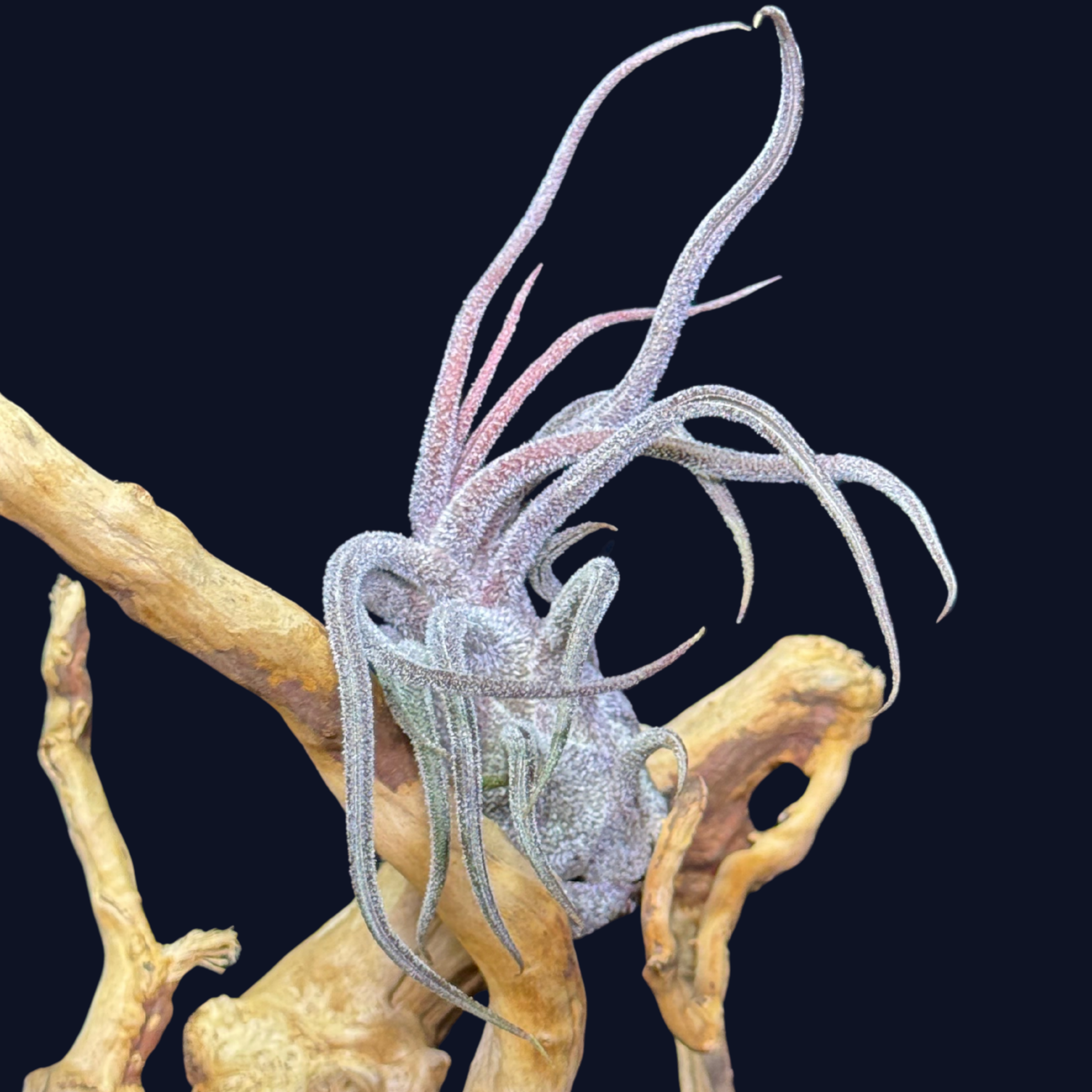 Tillandsia pruinosa nie wymaga podłoża – najlepiej prezentuje się zawieszona lub przymocowana do korka, gałęzi, korzenia lub ozdobnego kamienia.
